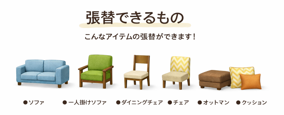 古くなった家具やお気に入りの家具を新しく生まれ変わらせる「張替」サービスをご紹介いたします。